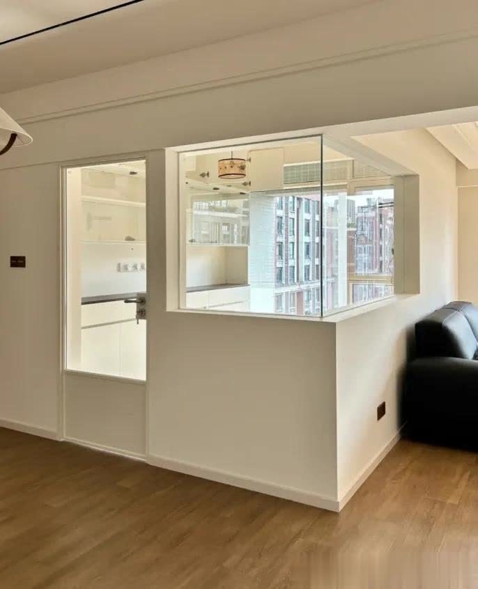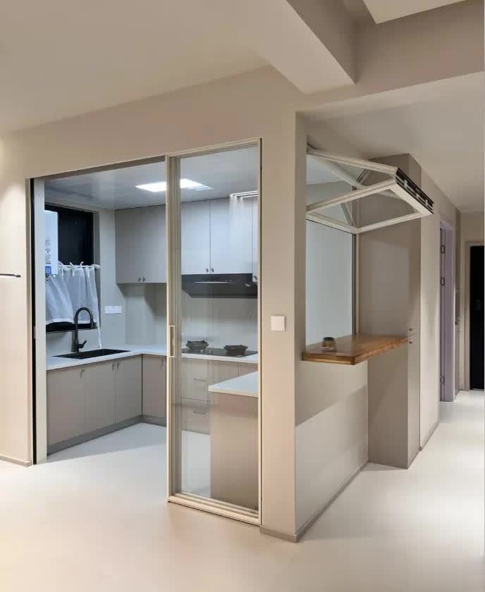 想做开放厨房又怕油烟,可以采用新开一扇窗,成就一个吧台,同时搭配玻璃门,满足开放的视觉感受,又能解决油烟问题《开放厨房,怕油烟,怕噪音,怕无法通气,直接做半开放式就行》